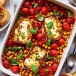 Baked Feta Chickpeas is a flavorful and wholesome Mediterranean-inspired dish featuring cherry tomatoes, chickpeas, and creamy baked feta cheese. Roasted until bubbly and topped with fresh basil, this recipe is an easy weeknight meal served with toasted bread.