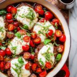 This Balsamic Glazed Caprese Chicken is a flavorful, oven-baked dish featuring juicy, skinless bone-in chicken thighs seasoned with herbs and glazed with a sweet and tangy balsamic sauce. Topped with fresh mozzarella and grape tomatoes, then garnished with fresh basil, this recipe combines classic Caprese flavors with hearty chicken for a deliciously satisfying meal.
