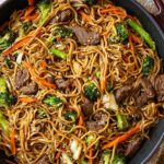 A flavorful and easy-to-make Beef Lo Mein recipe featuring tender beef strips, fresh vegetables, and perfectly cooked lo mein noodles tossed in a savory homemade sauce. This classic Chinese-American dish combines stir-fried beef, carrots, broccoli, and onions with a sweet and salty sauce for a satisfying and delicious meal that’s perfect for weeknight dinners.
