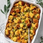 For holiday gatherings, I sometimes bake this stuffing in individual ramekins for a pretty presentation that guests love. Or flair it up by stuffing it inside hollowed acorn squash or bell peppers for a show-stopping centerpiece that’s as delicious as it is beautiful.