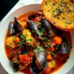 I don’t usually freeze this stew because seafood textures change when frozen, but if you must, freeze without bread and thaw gently overnight in the fridge. Reheat carefully to avoid overcooking the seafood.