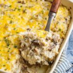 - Cheddar cheese: Sharp or mild—depends on your cheese preference! Dividing the cheese lets you mix some inside and get a golden cheesy top.