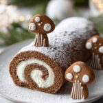 - Serve and Garnish: Before serving, dust the cake roll with more confectioners’ sugar and optionally garnish with gingerbread cookies or any preferred decoration. Slice with a sharp knife into even pieces and enjoy. Store leftovers refrigerated.