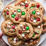 - Fold in Mix-Ins: Gently fold in the M&M’s, white chocolate chips, pretzel pieces, potato chip pieces, and red and green jimmies using a spatula until evenly distributed throughout the dough.