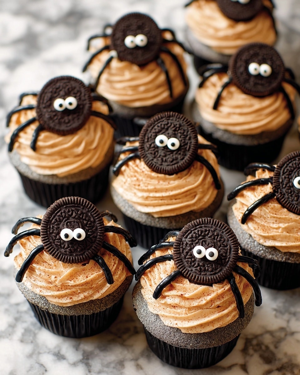 - Pipe Legs on Spider: Use the black-tinted buttercream with a small round tip to pipe eight spider legs extending from the Oreo on each cupcake for a spooky yet cute look.