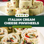 Italian Cream Cheese Pinwheels are a flavorful and easy-to-make appetizer featuring a creamy blend of seasoned cream cheese, roasted red peppers, olives, and fresh basil wrapped in spinach tortillas. Perfect for parties and gatherings, these pinwheels can be prepared ahead of time and sliced into bite-sized pieces for a delicious and colorful snack.