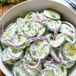 A refreshing and creamy cucumber salad featuring thinly sliced cucumbers and red onions tossed in a tangy sour cream and dill dressing, perfect for a light side dish or summer picnic.