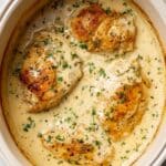 - Combine and Slow Cook: Place the seared chicken breasts into a 2.5-4 quart slow cooker. Pour the prepared cream sauce over the chicken, ensuring they are well covered. Cover the slow cooker and cook on low for about 3 hours, or until the chicken reaches an internal temperature of 165°F (74°C). Cooking time may vary depending on your slow cooker.