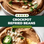 I love topping my Crockpot Refried Beans with freshly chopped cilantro and sliced green onions for brightness. Sometimes, a dollop of crumbled queso fresco or shredded cheddar turns these beans into an irresistible, melty side or dip. For a little extra heat, sliced jalapeños do the trick perfectly.