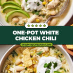 This one-pot white chicken chili is a hearty and creamy twist on the classic chili, combining tender shredded chicken, white beans, and green chiles in a flavorful broth. Perfect for game day or a simple weeknight dinner, it’s loaded with spices, corn, and topped with fresh avocado, cilantro, crunchy tortilla chips, and melted Monterey Jack cheese.