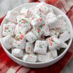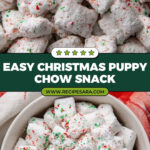 This festive Christmas Puppy Chow recipe is a deliciously sweet and crunchy treat made by coating Chex cereal in a melted chocolate, peanut butter, and butter mixture, then dusting it with powdered and sanding sugars for a perfect holiday snack.