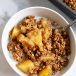 - Assemble: Lightly oil a small baking pan or line it with parchment paper. Spread the sautéed apples evenly over the base. Then squeeze and spread the crumble topping over the apples, forming larger clumps for texture.