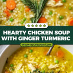 A warm, flavorful chicken soup featuring fresh ginger, turmeric, and tender chicken simmered with pearl couscous and vegetables for a comforting and nourishing meal.