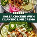 - Assemble and Serve: Serve the shredded salsa chicken in bowls with the cilantro-lime crema on top. Great with rice, tortillas, or as taco filling.