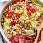 A vibrant and hearty Italian Chopped Brussels Sprouts Salad featuring thinly sliced Brussels sprouts tossed in a zesty homemade Italian dressing, mixed with chickpeas, savory Genoa salami, juicy tomatoes, olives, pepperoncinis, red onion, and a blend of provolone and parmesan cheeses. Perfect as a nutritious, flavorful side or light meal, this salad offers a delightful combination of textures and bold Italian flavors.