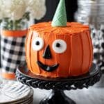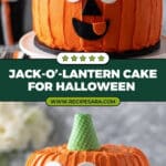 Create a festive Jack-o’-Lantern Cake perfect for Halloween celebrations by combining classic spice cake flavors with vibrant orange frosting and detailed fondant decorations. This creative cake features two baked spice cakes shaped and frosted to resemble a pumpkin, topped with an ice cream cone stem and decorated with Oreo cookie eyes and fondant facial features.