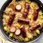 Savor the comforting flavors of Kielbasa and Sauerkraut, a hearty and classic Eastern European-inspired dish featuring smoky kielbasa sausage, tangy sauerkraut, tender diced potatoes, and aromatic caraway seeds, all cooked together in a skillet for a quick and flavorful meal.