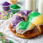 - Decorate: Immediately sprinkle with purple, green, and gold colored sugar before the frosting sets. Slice and serve. Tradition says the person who finds the baby in their slice is king or queen for the day!