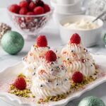 Delightfully festive Mini Pavlova Christmas Trees made from delicate meringue, whipped cream, and decorated with vibrant raspberries, pistachios, and silver cachous. These charming individual pavlovas are perfect for holiday celebrations, combining crisp edges with a soft, airy center and a decorative, snowy finish.