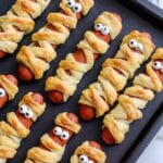 Leftover mummy dogs store wonderfully in an airtight container in the fridge for up to 3 days. I like to layer parchment paper between them to keep the dough from sticking together. When you’re ready to eat, just reheat gently to recapture that flaky texture without drying out the hot dog.