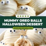 These spooky Mummy Oreo Balls are a fun and festive Halloween treat made with crushed Golden Oreos, cream cheese, and coated in vanilla candy melts. Featuring candy eyes and drizzled chocolate to resemble mummies, these no-bake snacks have a creamy interior with a crisp chocolate shell, perfect for parties or an easy dessert.