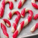 Once chilled, your dough should be firm but still malleable. If it’s too hard, let it sit for a few minutes—but don’t let it soften too much or it’ll get sticky and hard to handle. Pinch off a one-inch piece of the white dough and roll it out into a 5-inch rope on a cool surface. Do the same with a piece of the red dough, making sure the ropes are the same length. Place them side-by-side and carefully twist together, creating that classic candy cane swirl. Transfer to a parchment-lined baking sheet, then curve the top of the twisted dough into a candy cane shape. Repeat with the remaining dough, spacing cookies at least 2 inches apart.