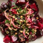 This Pickled Beet Salad is a vibrant, tangy, and refreshing dish featuring quick-pickled red onions and olives combined with tender boiled beets and fresh herbs. The salad is tossed in a zesty lemon and honey dressing that enhances the natural sweetness of the beets while adding a bright, pickled flavor. Perfect as a side dish or light lunch, it can be enjoyed warm or chilled, gaining more intensity when left to marinate in the fridge.