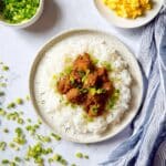 - Serve: Garnish the meatballs with the reserved green parts of the green onion. Serve hot over cooked white or brown rice, or cauliflower rice, with optional sriracha on the side for added heat.