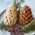 - Decorate with Almonds: Gently insert the toasted almonds into one cheese ball in horizontal rows at a slight angle to mimic pinecone scales. Use whole almonds for one pinecone and sliced almonds for the other to create visual contrast.