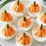 Pumpkin Deviled Eggs are a festive and easy-to-make appetizer perfect for Halloween, Thanksgiving, or any fall gathering. This creative twist on classic deviled eggs uses a creamy filling tinted to resemble small pumpkins, garnished with chive ‘stems’ and smoked paprika for a seasonal touch.