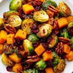 A delicious and colorful Thanksgiving side dish featuring roasted Brussels sprouts and cinnamon-spiced butternut squash, combined with toasted pecans and dried cranberries for a perfect balance of savory, sweet, and nutty flavors.