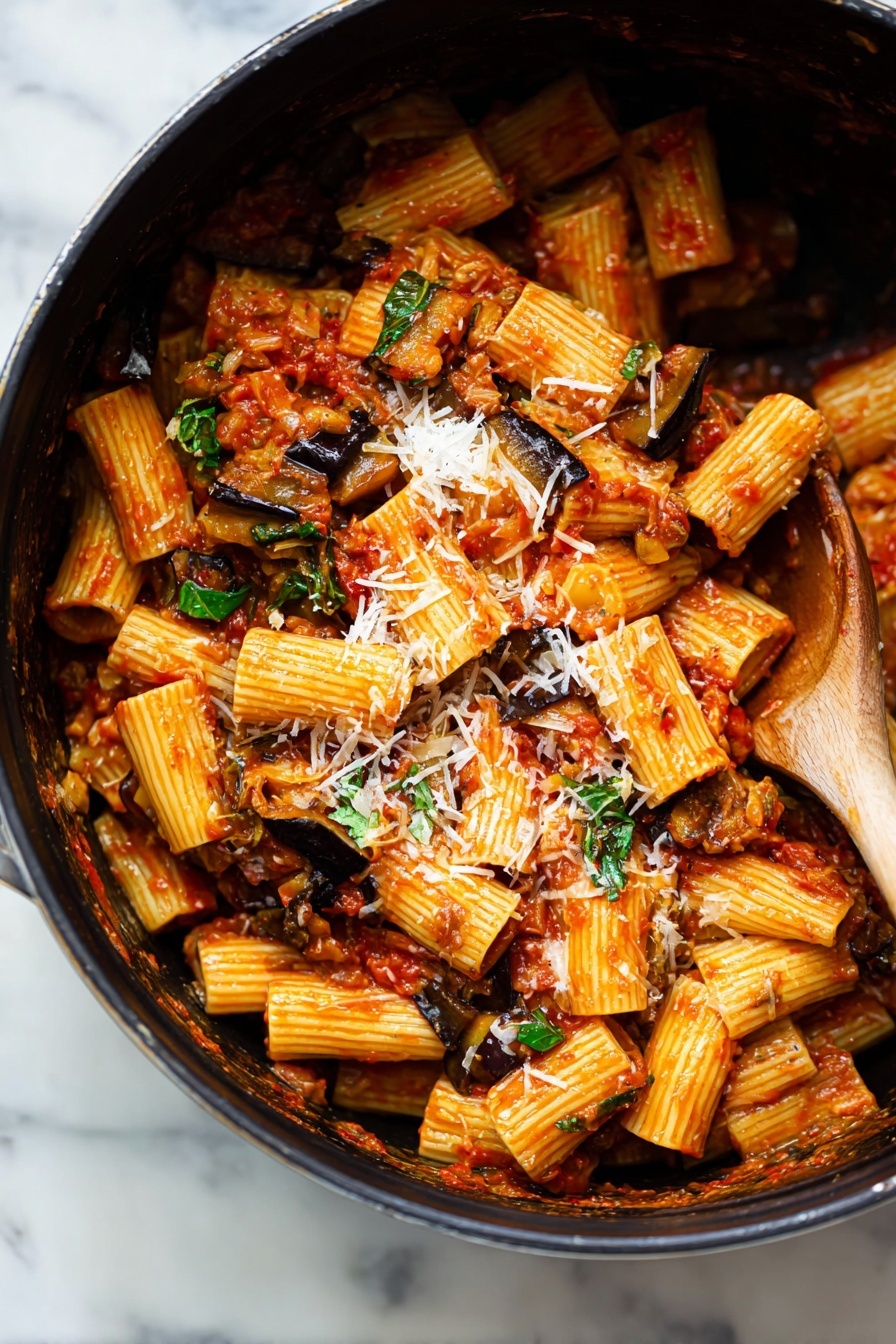 While the eggplant roasts, bring a large pot of salted water to a boil. I always add about a tablespoon of salt for pasta—it really seasons the strands. Cook your rigatoni (or pasta of choice) until al dente, following package directions. Before draining, scoop out about half a cup of pasta water—this starchy water is liquid gold for adjusting your sauce’s consistency. Drain the pasta and return it to the pot.