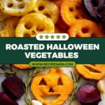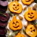This festive Roasted Halloween Vegetables recipe features sweet potatoes carved like jack-o-lanterns, white potatoes as ghost shapes, beet slices shaped like witch’s hats, and whole carrots as witch’s fingers. Boiled briefly to soften, then roasted with rosemary, garlic, balsamic vinegar, and honey, these veggies make a fun and flavorful seasonal side dish perfect for Halloween celebrations.