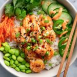 - Assemble bowls: Start with a base of cooked rice (or a rice and shredded lettuce combo if preferred). Top with cucumber, jalapeño, carrots, edamame, and the saucy shrimp mixture.