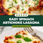 This Spinach Artichoke Lasagna is a healthy and flavorful vegetarian dish packed with fresh spinach, artichokes, and a simple homemade tomato sauce. It combines creamy cottage cheese, tender spinach-artichoke filling, and melted fontina or mozzarella cheese layered between no-boil noodles for an easy, wholesome meal perfect for family dinners or meal prep.