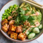 - Assemble the Bowls: Divide the cooked rice evenly among 4 bowls. Top with shelled edamame, sliced cucumber, and diced avocado. Arrange the glazed tofu cubes on top.