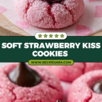 Delightfully soft and chewy Strawberry Kiss Cookies made with a strawberry cake mix and cream cheese, featuring a chocolate Hershey’s Kiss in the center for a perfect sweet and fruity treat.