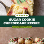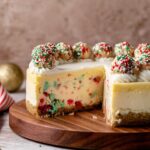 This Sugar Cookie Cheesecake combines a rich and creamy cheesecake with festive sugar cookie dough balls and a colorful sprinkle crust. Featuring a buttery sugar cookie crust, soft chunks of sugar cookie dough baked inside the cheesecake, and a luscious white chocolate ganache topping, it’s the perfect holiday dessert to wow your guests with both flavor and eye-catching presentation.