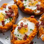 This Breakfast Sweet Potato recipe transforms hearty baked sweet potatoes into a delightful morning meal, filled with a savory mixture of crispy bacon, melted cheddar, butter, and eggs baked directly inside the potato skins. Topped with fresh scallions, it combines wholesome ingredients for a comforting and protein-packed breakfast.