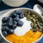 A delicious and nutritious Sweet Potato Breakfast Bowl made with roasted sweet potatoes blended into a fluffy base, enhanced with almond milk, almond butter, maple syrup, and warm cinnamon. Topped with fresh blueberries, crunchy pumpkin seeds, and creamy Greek yogurt for a wholesome, energizing start to your day.
