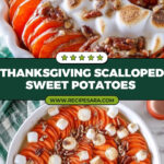 This Thanksgiving Scalloped Sweet Potatoes recipe features thinly sliced sweet potatoes baked in a rich, spiced butter and brown sugar sauce, topped with toasted pecans and mini marshmallows for a festive and comforting side dish that’s perfect for holiday meals.