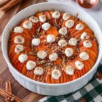 This Thanksgiving Scalloped Sweet Potatoes recipe features thinly sliced sweet potatoes baked in a rich, spiced butter and brown sugar sauce, topped with toasted pecans and mini marshmallows for a festive and comforting side dish that’s perfect for holiday meals.