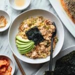 For that extra umami punch, sprinkle your bowl with furikake and/or fried garlic if you like. Then take a roasted seaweed sheet, scoop some of the salmon rice mixture onto it, add a slice or two of creamy avocado, and wrap it up like sushi—it’s addictive! I almost always serve this with a side of kimchi for a tangy contrast that makes my family go crazy every time.