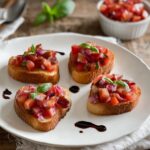 - Serve: Optionally, drizzle balsamic glaze over the assembled bruschetta for a sweet and tangy finish. Serve immediately to enjoy the warm, crispy bread and fresh topping combination.