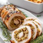 This Turkey Roulade with Sausage Stuffing is a flavorful and elegant main dish perfect for festive occasions or a special family dinner. A boneless turkey breast is butterflied, pounded thin, and stuffed with a savory Italian sausage stuffing made from onions, celery, and herb stuffing mix. Rolled tightly, tied with kitchen twine, and baked to juicy perfection with a garlic butter rub, this roulade delivers a juicy, aromatic centerpiece packed with comforting flavors.