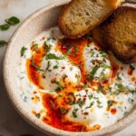 Çılbır is a classic Turkish breakfast dish featuring perfectly poached eggs served over a creamy herbed Greek yogurt and topped with a fragrant Aleppo pepper-infused butter sauce. This simple yet elegant dish is finished with fresh herbs, flaky sea salt, and warm pita or crusty bread for dipping, delivering a delightful blend of textures and flavors.