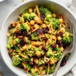 A vibrant and nutritious Vegan Curried Broccoli Chickpea Salad featuring finely chopped broccoli, chickpeas, carrots, toasted almonds, and a flavorful tahini curry dressing. Perfect as a light lunch or side dish, this salad is naturally plant-based, packed with protein and fiber, and easy to prepare in under 30 minutes.