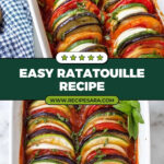 This Ratatouille recipe is a classic French vegetable stew baked to perfection with fresh summer veggies, crushed tomatoes, and aromatic herbs. Layered in a beautiful, colorful arrangement, this dish combines zucchini, Japanese eggplant, onions, and ripe tomatoes seasoned with garlic, basil, herbs de Provence, and a touch of chili powder. Perfect as a side or a main course, it can be served hot or cold and is vegan, gluten-free, and paleo-friendly.