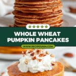 These Whole Wheat Pumpkin Pancakes are a delicious and healthy breakfast option that is both egg and dairy-free. Made with pumpkin puree, warm spices, and whole wheat flour, these pancakes are fluffy, flavorful, and perfect for a cozy morning. Topped with vegan whipped cream, maple syrup, and pecans, they make a satisfying plant-based treat.