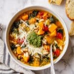 This Winter Minestrone Recipe brings together fresh produce and pantry staples that balance sweetness, earthiness, and a little tang for a perfectly rounded flavor. When shopping, look for firm butternut squash and sturdy kale for the best texture in your soup.
